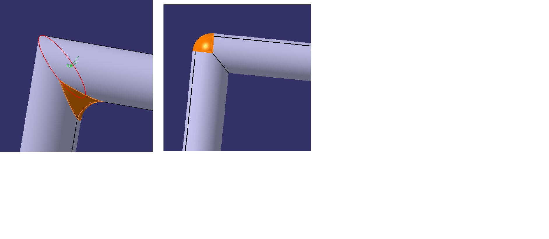 díky za rady. Face-Face fillet funguje bezva - díky pane Admine. Pro určení zda radius vytvořit vně (obr.vlevo) nebo uvnitř (obr vpravo) je zde asi skutečně jen určující první vybírané místo na ploše. Pomocí rib to vytvoří něco trochu jiného než já potřebuju - viz obr. dole (buď minimálně rádius dvakrát větší než je R trubky, nebo pak ostrý roh - nic mezi nezvládne) |